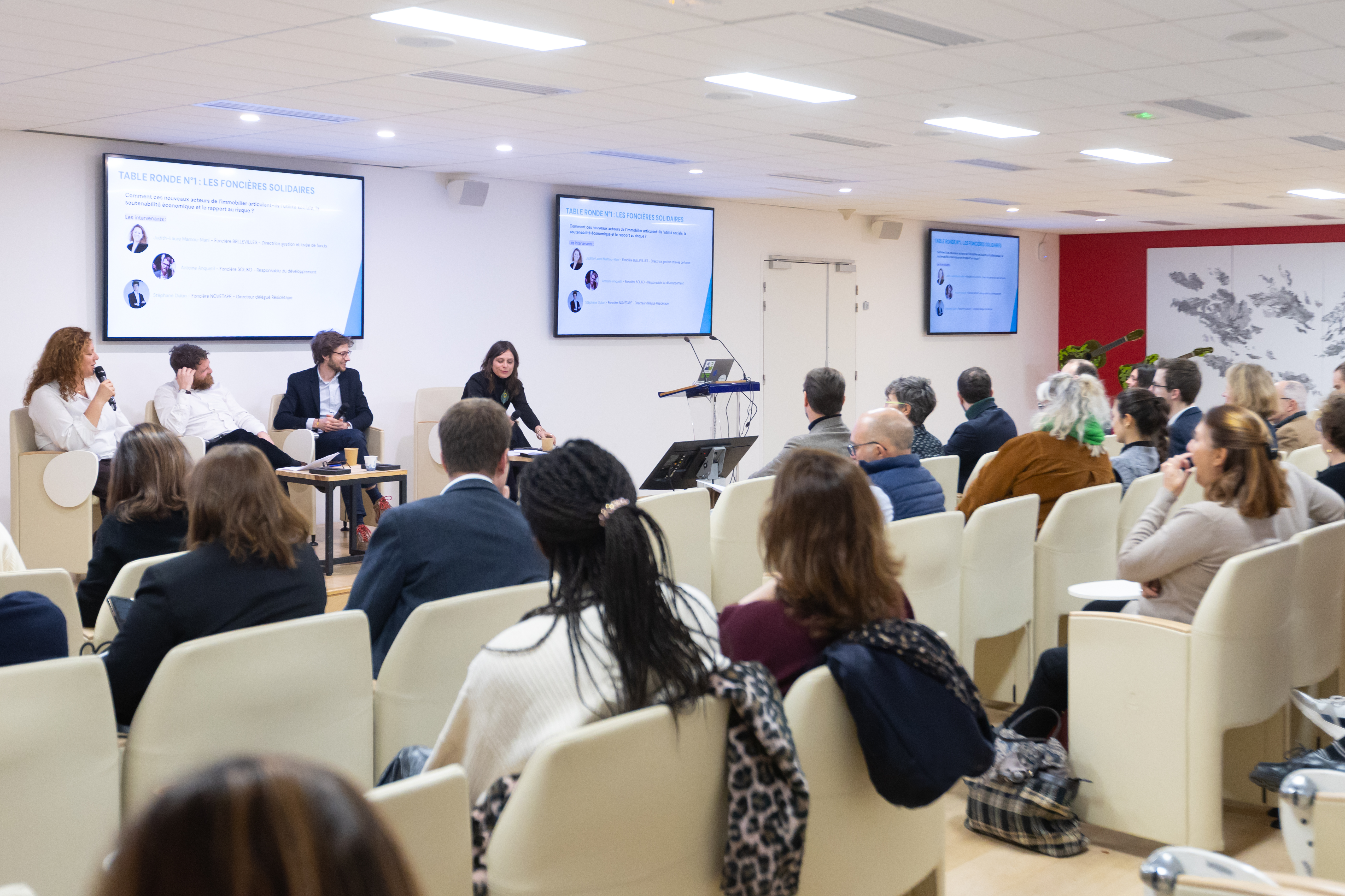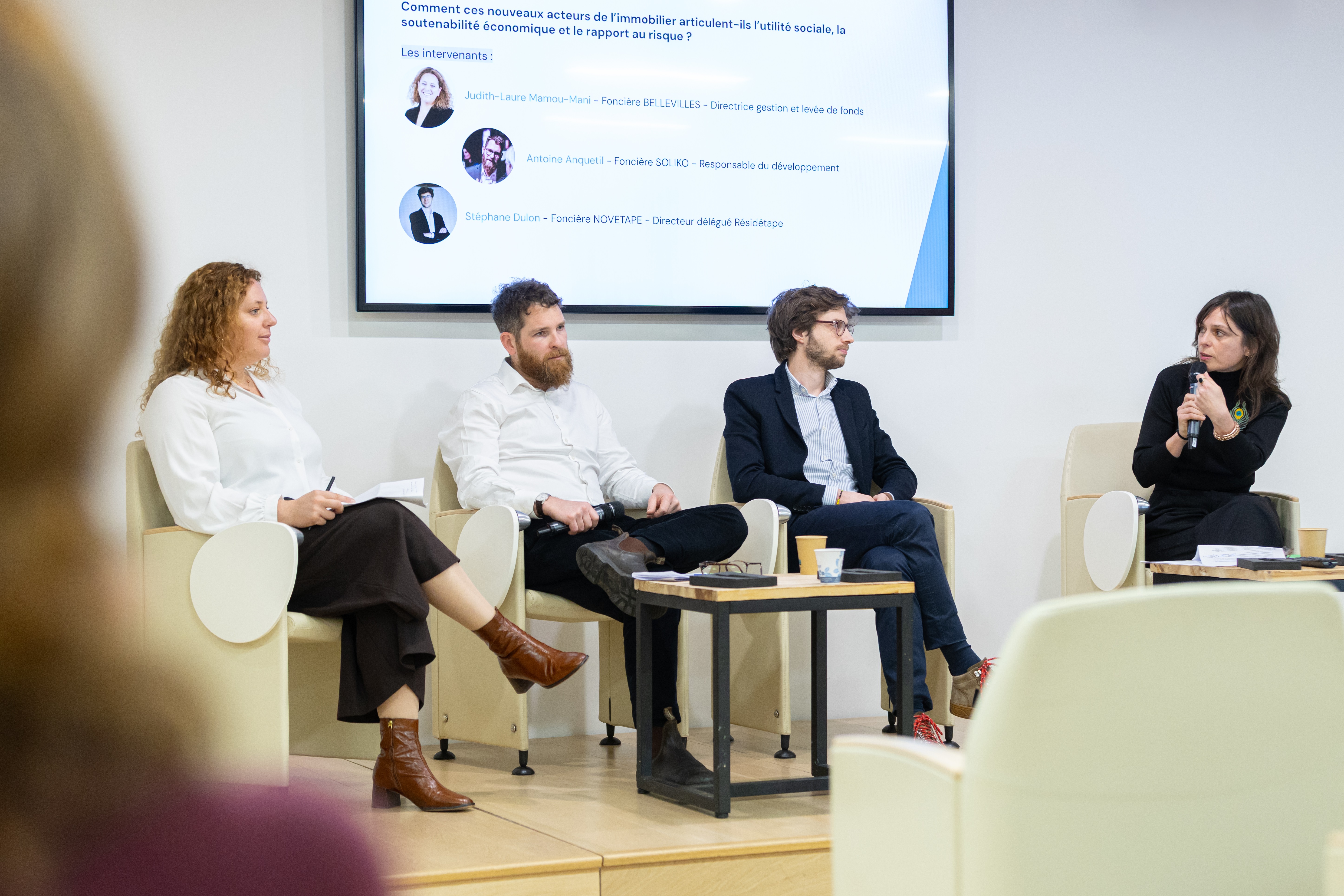 La première table ronde a permis à quatre acteurs de foncières solidaires Judith-Laure Mamou-Mani (Foncière BELLEVILLES), Antoine Anquetil (Foncière SOLIKO), Stéphane Dulon (Foncière NOVETAPE) et Sébastien de Hulster (Foncière DE WATOU) de présenter et comparer leurs modèles économiques dans l’écosystème immobilier.